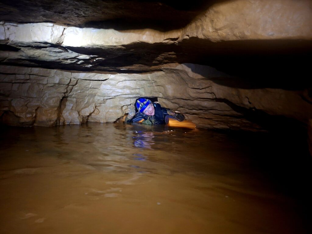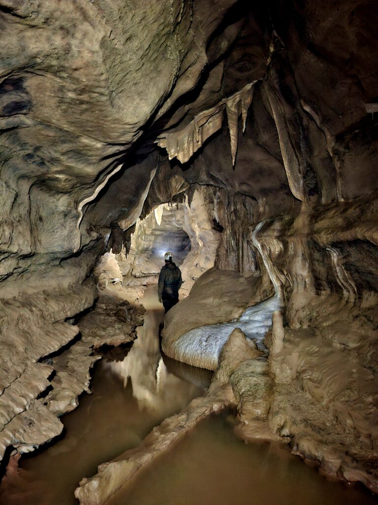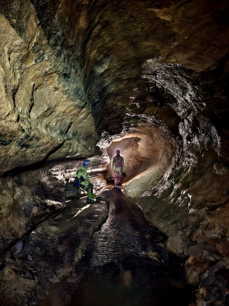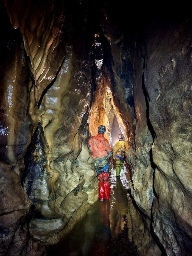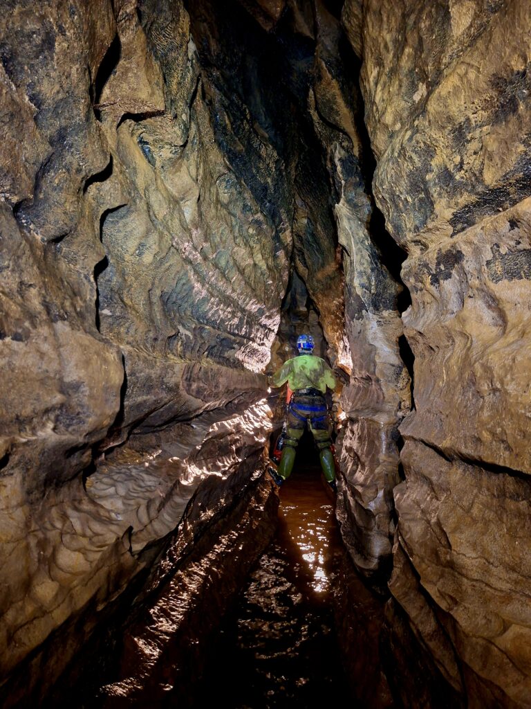 Samedi : aujourd’hui, c’est la rivière souterraine de Cerre-les-Noroy. La cavité fait partie du réseau qui alimente la ville de Vesoul en eau potable et est donc fermée. Jean-Luc aura la gentillesse de nous donner l’accès. L’entrée commence par un puits de 15m fractionné (2AN-4B) qui surplombe une trémie. Un petit ruisselet s’écoule à sa base. Nous parcourons d’abord l’aval sur une centaine de mètres avant d’arriver au siphon. De retour à la première salle, nous cherchons la désescalade parmi les blocs pour rejoindre le méandre et suivre l’aval. On a l’impression qu’il se découpe en 3 parties. Tout d’abord, la galerie offre une progression variée, ponctuée de 4 pattes et parfois concrétionnée. À 500m de l’entrée, nous arrivons à un croisement où se jette l’affluent GSRH, que nous ferons au retour. Les proportions de la galerie changent, offrant une belle progression entre marmites et bassins, jusqu’à une voute basse qui aujourd’hui passe largement. Nous pensons qu’il y a plus d’eau habituellement car la néoprène complète n’était pas forcément nécessaire. Le profil change de nouveau, offrant des formes elliptiques. Nous arrivons au siphon à environ 1500m de l’entrée. Demi-tour, nous ferons un détour par l’affluent où la progression se complique. La galerie est plus argileuse et ébouleuse. TPST : 4 h