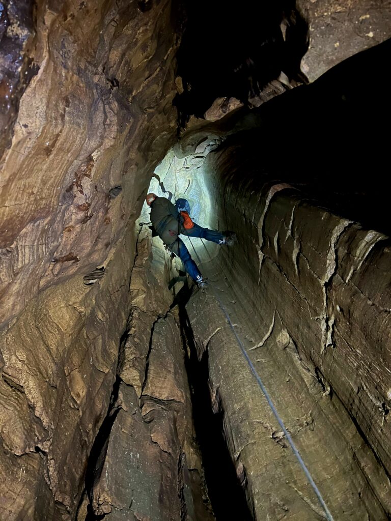 Lundi : grasse mat, aujourd’hui nous avons le temps car nous visiterons le trou Pinard (C30 2AN 7S). Connue dans la région pour être une grotte initiatique, cette cavité est certes courte mais très jolie. Elle débute par un ressaut de 3m suivi d’un puits de 6m qui ont visiblement été creusés avec beaucoup de détermination ! Cela débouche sur un beau puits photogénique de 14m. Une petite porte dans la roche nous emmène directement dans le collecteur. Nous suivrons l’aval où nous admirerons la forme de la galerie qui témoigne de la mise en charge qu’elle peut subir. La rivière disparait dans les blocs et notre progression continue au sec, dans une conduite forcée où l’air se fait rare. Nous franchissons 2 bauges à cochons qui nous rappellent le Chaland et arrivons au-dessus d’une pente glissante équipée d’une corde à nœuds. Nous sommes dans la salle de la cascade où nous reprenons peu à peu nos esprits. Pour certains, c’était leur premier CO₂ ! La rivière se sépare en 2, comme l’aval est inaccessible, direction l’amont et sa galerie des marmites. Nous arrivons rapidement au siphon et nous réaliserons quelques clichés sur le retour. TPST : 4 h