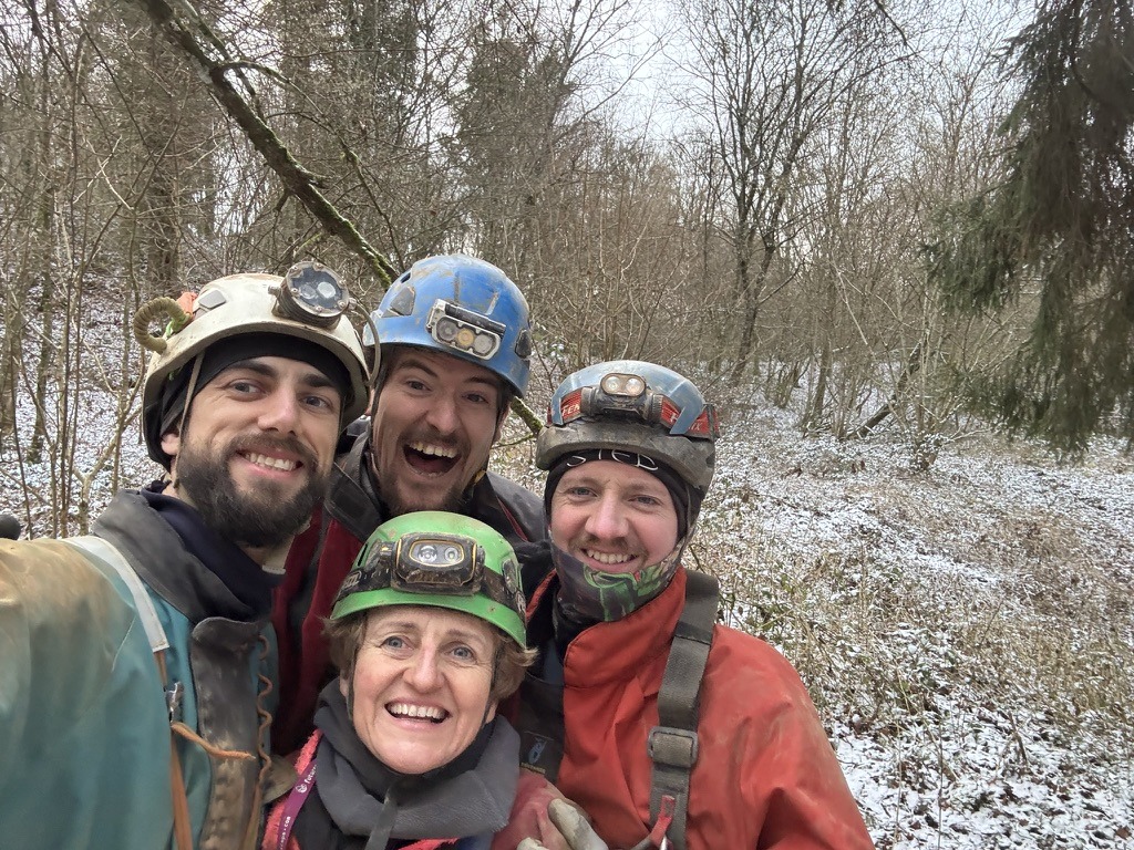 Ce samedi 3 janvier, quatre courageux, à peine remis du réveillon, se retrouvent à Izier pour une visite du chantoir de Ronsombeux afin d’en vérifier et compléter l’équipement (broche, spit, amarrage foré…).