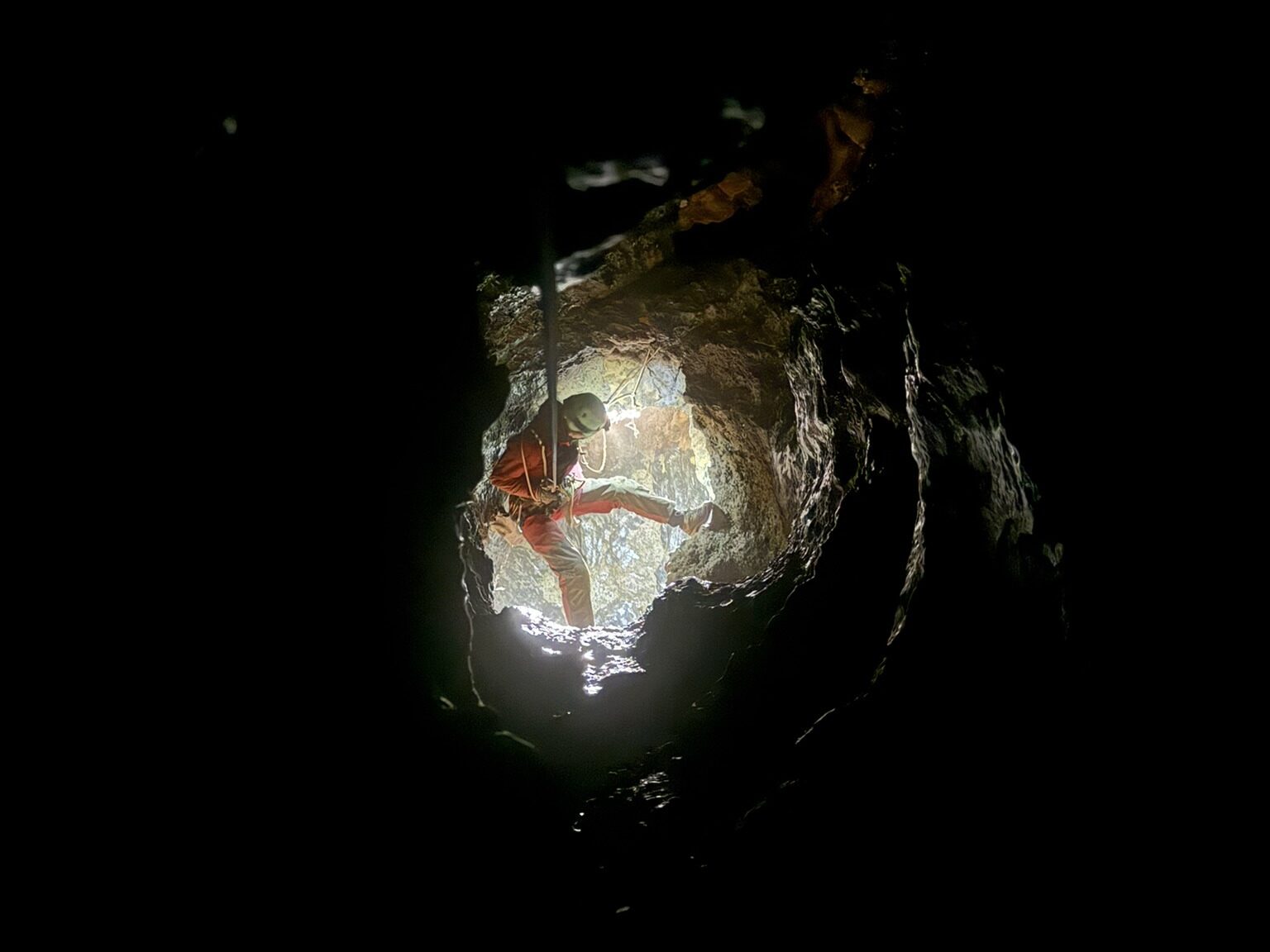 Passé la première étroiture, la tête de puits est équipée par Amaury d’un joli fusion tressé dans les broches en place. Lors de la visite en mars 2024, il était apparu qu’un complément d’équipement serait approprié pour éviter les frottement de corde. La grotte n’ayant pas sensiblement bougé et aucun équipement n’étant apparu spontanément. Amaury perce un trou dans la roche en milieu de puits afin de pouvoir ajouter une déviation. Ce n’est donc pas un amarrage naturel Maud, puisqu’il est foré !! Le dessus du second puits est équipé par Laurent sur une broche et un amarrage foré percé par celui ci ( objet de la visite ). Christopher profite du moment pour faire quelques photos 🙂