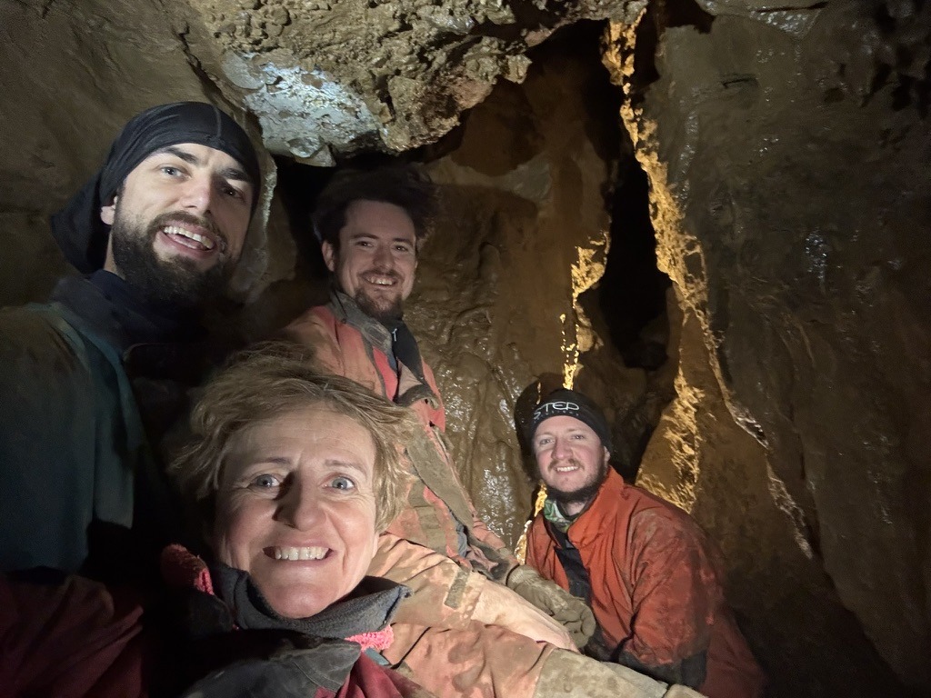 La remontée passe par une étroiture qui s’avère très douloureuse pour Amaury car il doit s’appuyer sur son genou récemment écorché. Suivent Christopher, et Laurent, ce dernier veillant au bon déséquipement par Maud.
