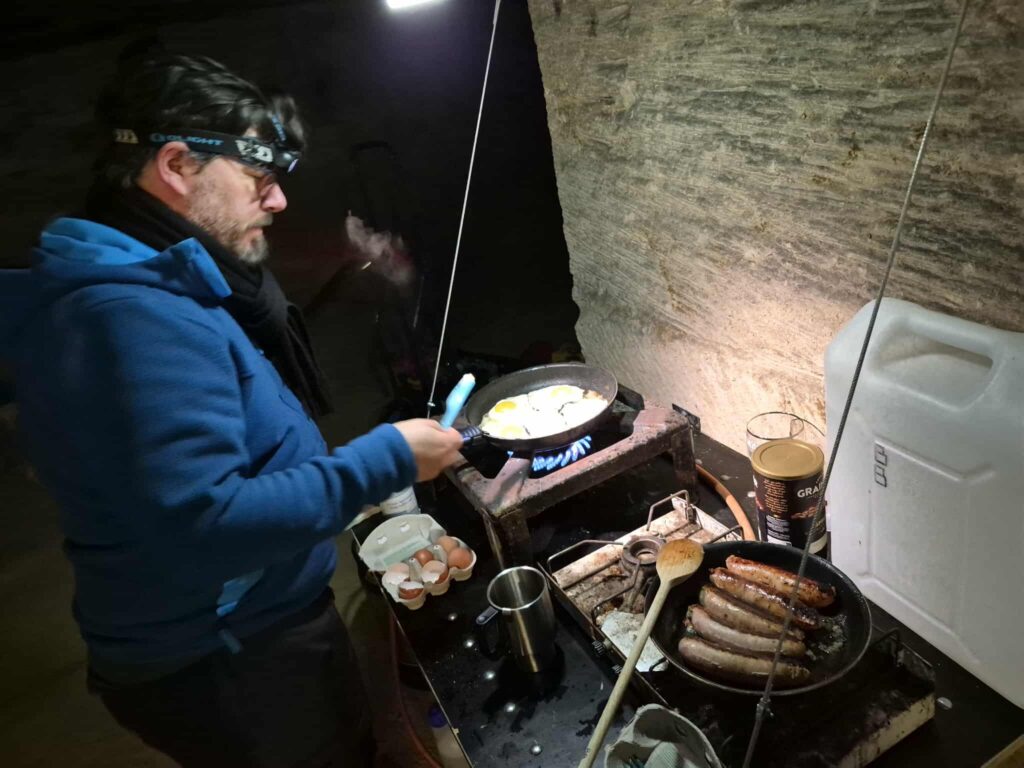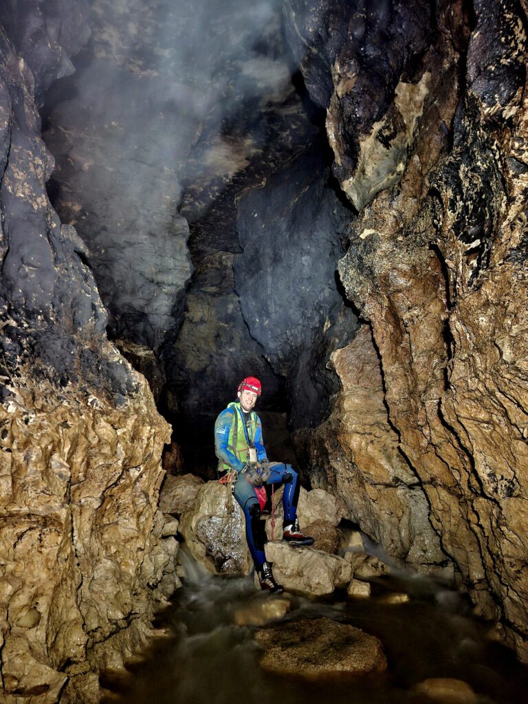 Nous sommes réveillés par la surprise annuelle de l’ULS, un petit déjeuner royal, œuf/saucisse ! Médy nous rejoindra du Luxembourg à ce moment-là. Le programme de cette année diffère un peu ; peu nombreux, pas de nouveaux côtés RCAE, 1 chez l’ULS. De plus, l’entrée de la Besace a subi un effondrement et on nous demande de ne pas accéder à la grotte avant la stabilisation par un club local. Nous ferons donc 2 équipes. Amaury, Sylvain, Stéphane, Maud et Médy équiperont les 2 entrées de la Sonnette, L’avenir sera réalisé par Charlotte, Laurent, Matéo, Cyril et Martin. Un seul gros club présent en plus de nous et beaucoup d’eau rythmeront la journée. La configuration annuelle permet de réaliser un lointain projet de Matéo, refaire la topo de la Sonnette. Il s’activera à la faire avec Laurent, Topodroid et un DistoX capricieux ! « Info 290 » sera le maître mot de la sortie !
