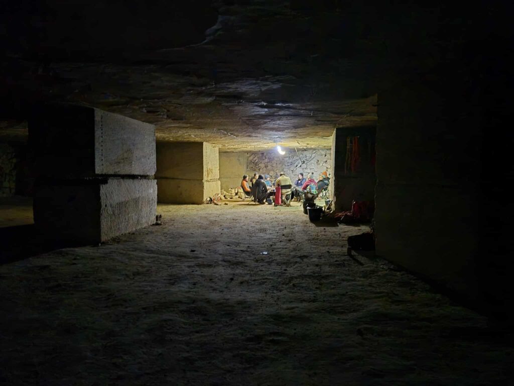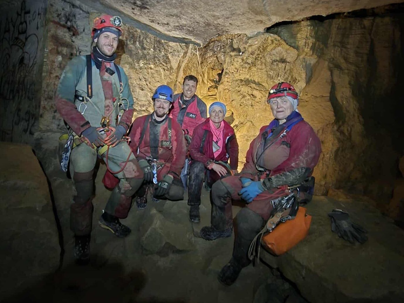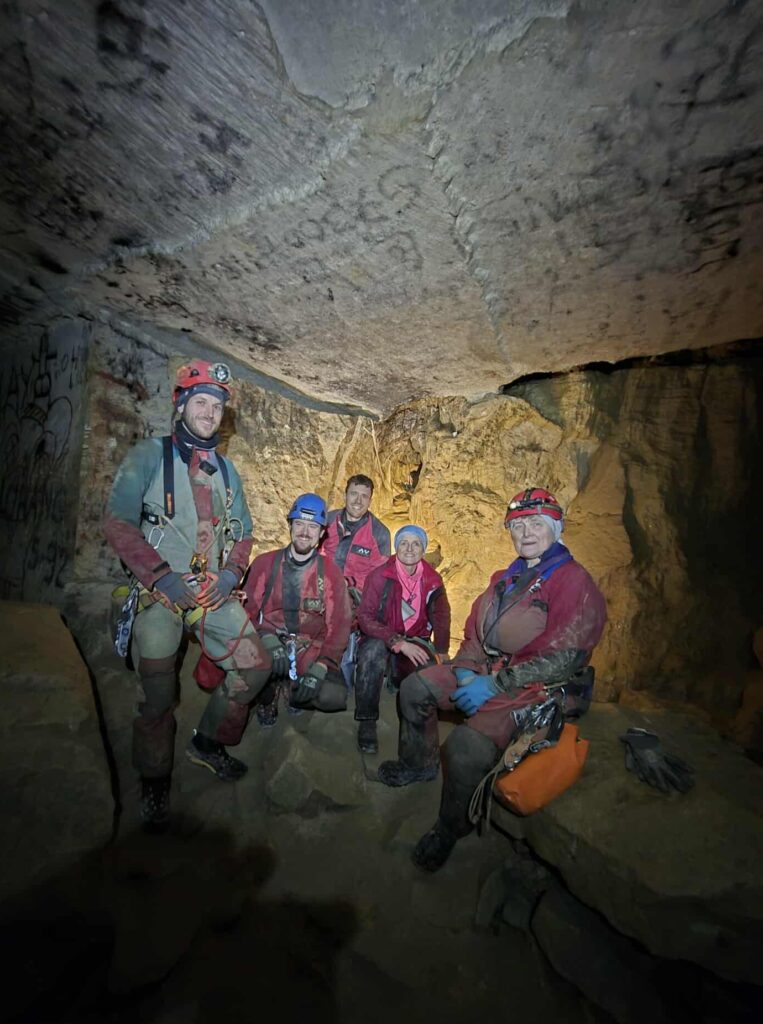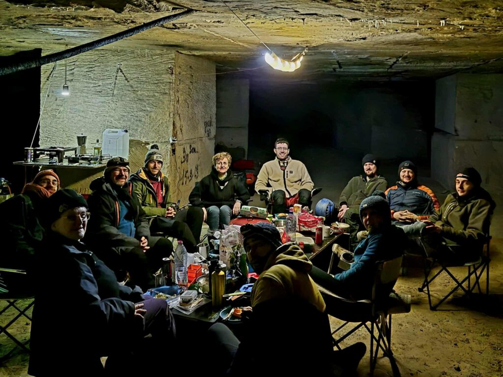 Comme le veut la tradition, nous revoilà partis dans les carrières souterraines de Savonnières-en-Perthois. Mais cette année, un petit cafouillage dans les dates dégraisse les troupes ; nous ne serons que 11. Les 3 courageux pour la grotte du vendredi soir découvriront un Rupt du Puits bien chargé. Après la descente de 50 m, laborieuse pour Charlotte, l’eau du collecteur arrive très vite au niveau des cuisses ! La progression de 2,5 km à contre-courant est laborieuse et fatiguante, mais donne une autre dimension à la grotte et un dynamisme que les habitués découvrent et apprécient. Parfait pour la 1ʳᵉ fois de Laurent ! Après avoir nagé 2 fois avant la marmite tant redoutée par Charlotte, elle s’incline quand Stéphane perd pied dans celle-ci ! Les 2 garçons iront jusqu’au siphon amont pour un selfie de fond raté, et reviendront par la main courante au plafond surplombant la rivière. Regroupé, le retour est beaucoup plus rapide. TPST : 3 h