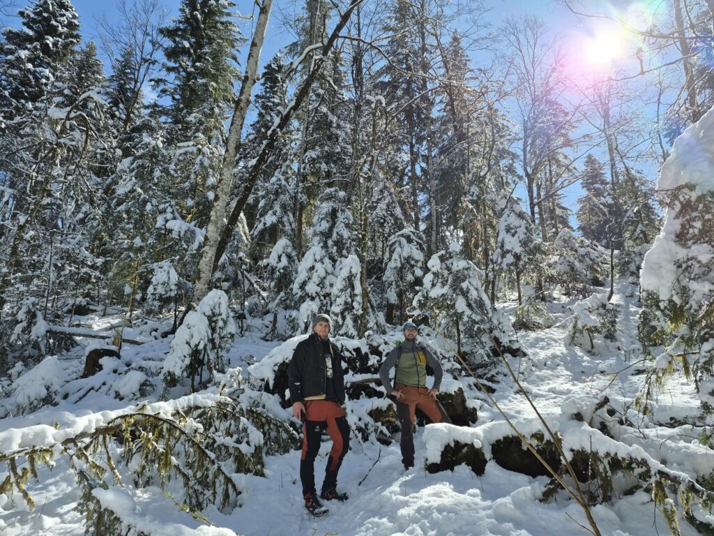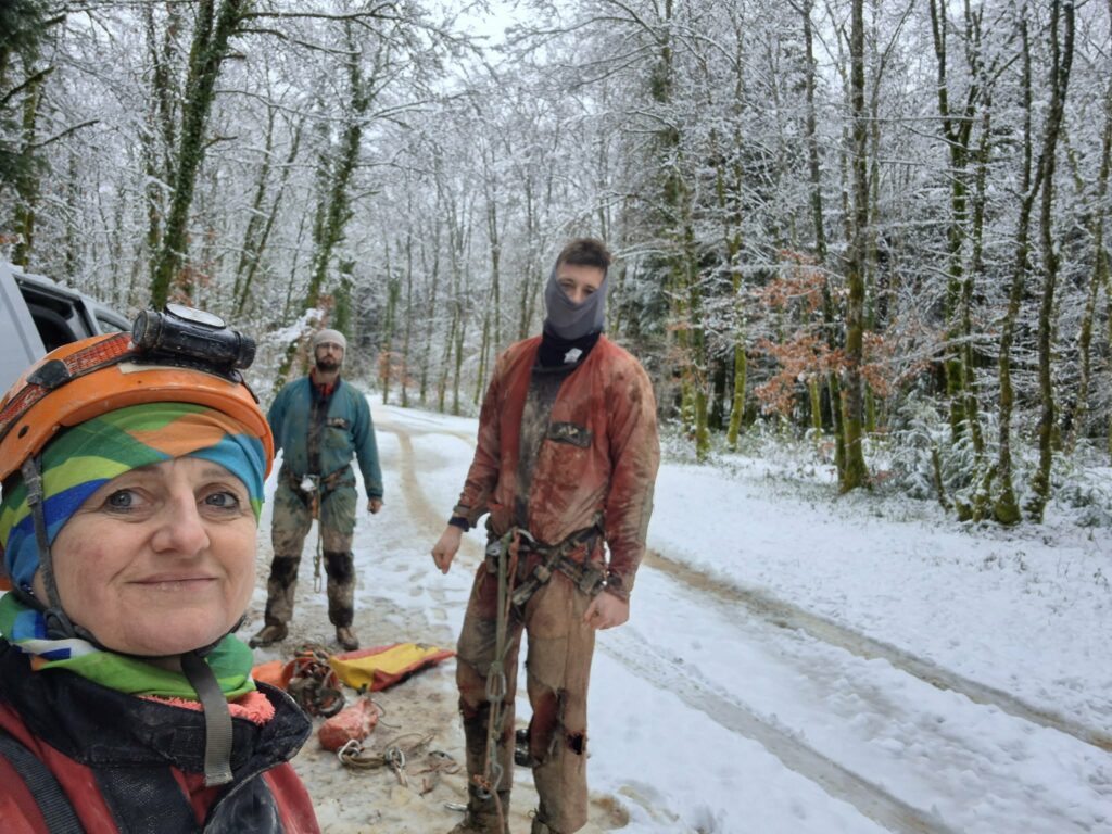 Ce samedi 14 mars, notre plan initial, de visiter la Lésine au miroir et la grotte de la Pontoise, se voit modifié par une belle couche de neige tombée durant la nuit, qui empêche les accès à beaucoup de cavités. Steph, Lio et Maud se dirigent sur le conseil des organisateurs vers la Lésine du champ Guillobot, alors qu’Oli décide de profiter des exposés de la conférence. L’entrée verte de mousse est gelée et couverte de neige, qui rend ́l’accès glissant. Stéphane descend en premier, ce qui dégivre et dégorge la corde de son eau. Le passage de Lio termine le travail et Maud trouve alors ce P38 largement fractionné très agréable à descendre ! Dès la descente, chacun est impressionné par la taille et l’immensité des concrétions. Arrivés au pied du puits, nous apprécions la différence entre la température de la cavité et le froid de la surface. La salle est parsemée de stalagmites dont certaines en empilement d’assiettes font plusieurs mètres de hauteur. Nous explorons les deux côtés de la cavité en contournant les nombreuses stalagmites, dont certaines évoquent un peu la tour de Pise. Ce concrétionnement d’une taille exceptionnelle est d’ailleurs réputé inégalé dans le Jura. À la remontée, nous innovons avec un jeu très approprié : la bataille de boules de neige verticale !