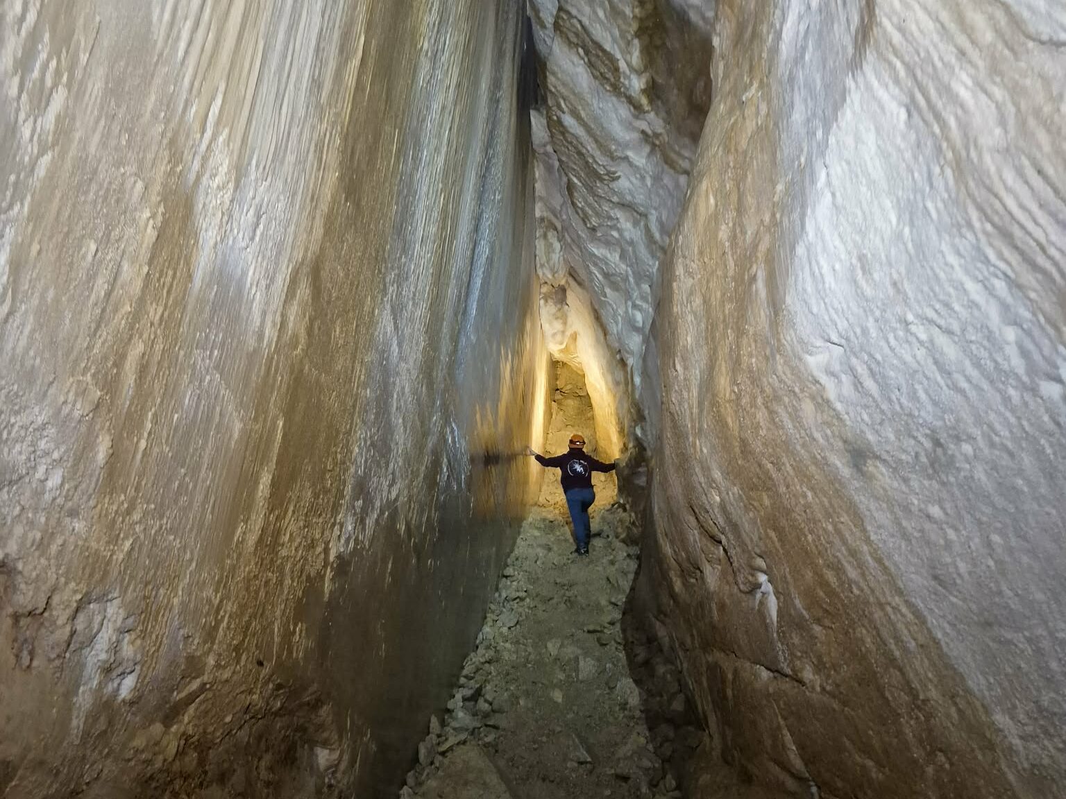 Par ce beau dimanche ensoleillé, nous nous dirigeons vers le cirque du Vaucluse rendu accessible grâce à un redoux après les fortes chutes de neige de la veille. Notre objectif est une singularité géologique qu’Oli ambitionnait de visiter de longue date. La lésine au Miroir est une petite cavité qui ne nécessite aucun équipement personnel, à tel point que nous y allons en tenue de rando. Après une main courante descendante et glaiseuse, nous atteignons rapidement un couloir d’environ 50 mètres de long, dont un des murs s’élève verticalement, presque parfaitement lisse, sur une vingtaine de mètres de haut. Au bout de la galerie, son aspect est comparable à celui du marbre poli. Nous prenons quelques photos, mettant en valeur la couleur de notre club !