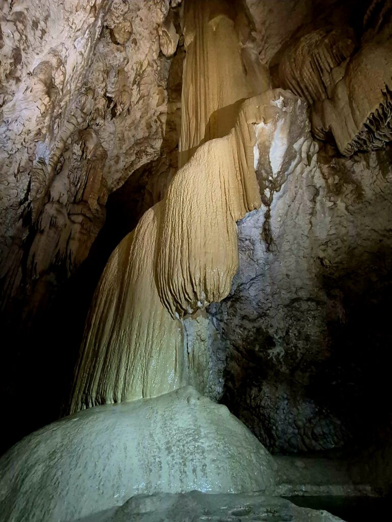 Une petite marche d’approche dans un bois nous amène à l’entrée de la cavité de la Lésine de Fontenu.. Le puits de 37 mètres s’ouvre directement sous nos pieds en bordure de chemin, fort heureusement sécurisé par un enclos métallique. Stéphane profite de l’équipement en place pour rapidement s’enfoncer dans le puits. Dès son arrivée en bas il est directement subjugué par la beauté de la grotte. Sitôt les compagnons réunis, nous descendons une pente légère et caillouteuse qui nous amène vers d’immense concrétions blanches dont la forme évoque des chutes d’eau. L’endroit est une suite de salles spacieuses décalées les unes par rapport aux autres, agrémentées de cheminées concrétionnées. Nous arrivons rapidement au bout de la cavité où nous découvrons de nombreuses traces de griffes d’animaux probablement coincés au fond de la grotte. Sur le retour nous sommes impressionnés par la quantité d’ossements de grande taille présents à la base du puits. Pendant la remontée du puits par Lionel et Olivier, Stéphane se rend compte qu’il n’a plus son pantin. Retour express jusqu’au fond de la grotte, accompagné de Maud, à la recherche du pantin perdu. Ne le trouvant pas, retour vers le puits afin de remonter les 37 mètres et ne pas trop faire attendre les copains. Bonne surprise à la base du puits : le pantin perdu était posé sur un rocher à côté de la corde ! Maud égare ensuite son gant juste avant de remonter… décidément quelle équipe !