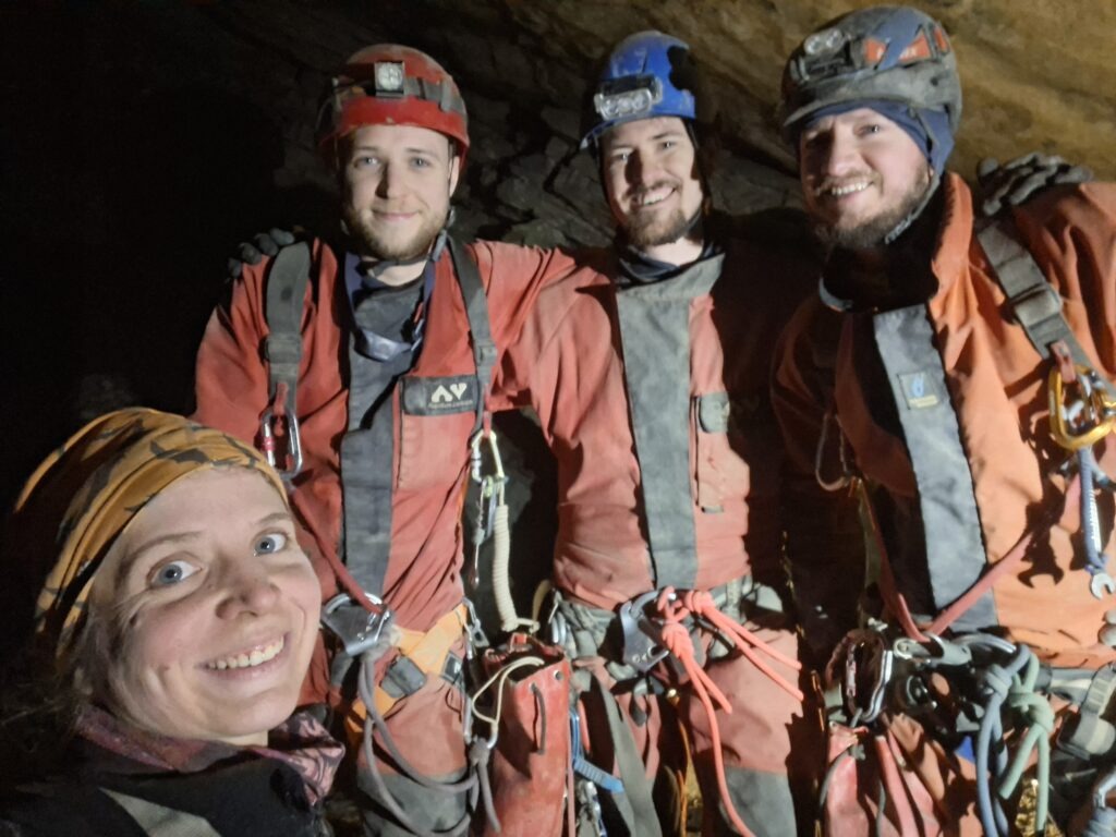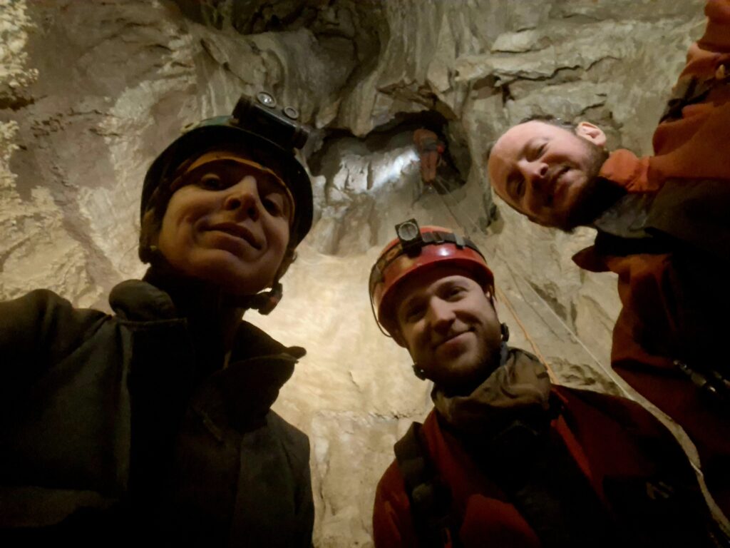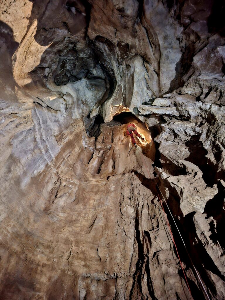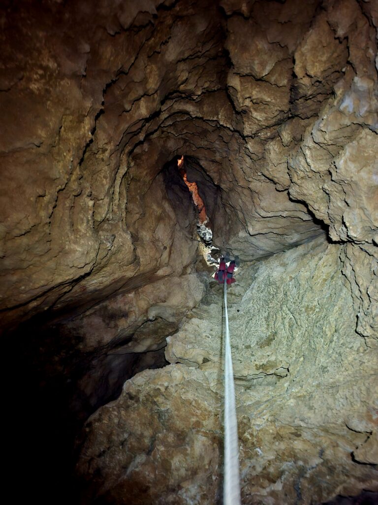 La remontée se fait au rythme des kits. La grotte n’est pas réellement paumatoire, et nous nous servons d’indices pour trouver le bon cheminement. La cavité est très sèche et la quantité d’eau à emporter n’est pas à négliger. Le déséquipement est réalisé par Charlotte et Maxime. Celui-ci, pendu au-dessus du P40, s’est Vauvouchié en enlevant la vire aérienne.