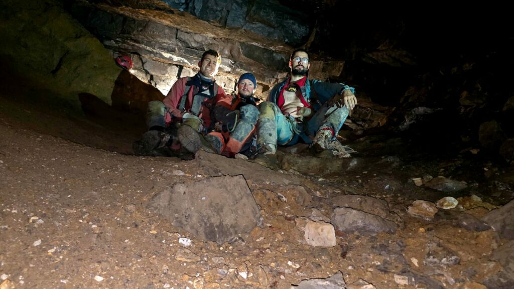 A l’enkitement, nous analysons les nouveaux kits fraîchement acquis et sommes surpris de la quantité de corde qui rentre dedans. Arrivés devant la grotte, nous apprécions cette main courante montante en fixe. Stéphane s’étonne de comment ses copains faisaient avant pour monter et surtout redescendre cette pente parfois vraiment glissante. À l’aide d’une jolie main courante sélectionnée par Laurent, Stéphane commença une série de rentrées et sorties du laminoir en vue d’équiper le premier puits de 10 m.